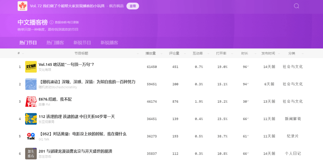 能随时查看中文播客的排名和热门节目的工具,数据取自小宇宙和 Apple Podcast,数据每日更新。