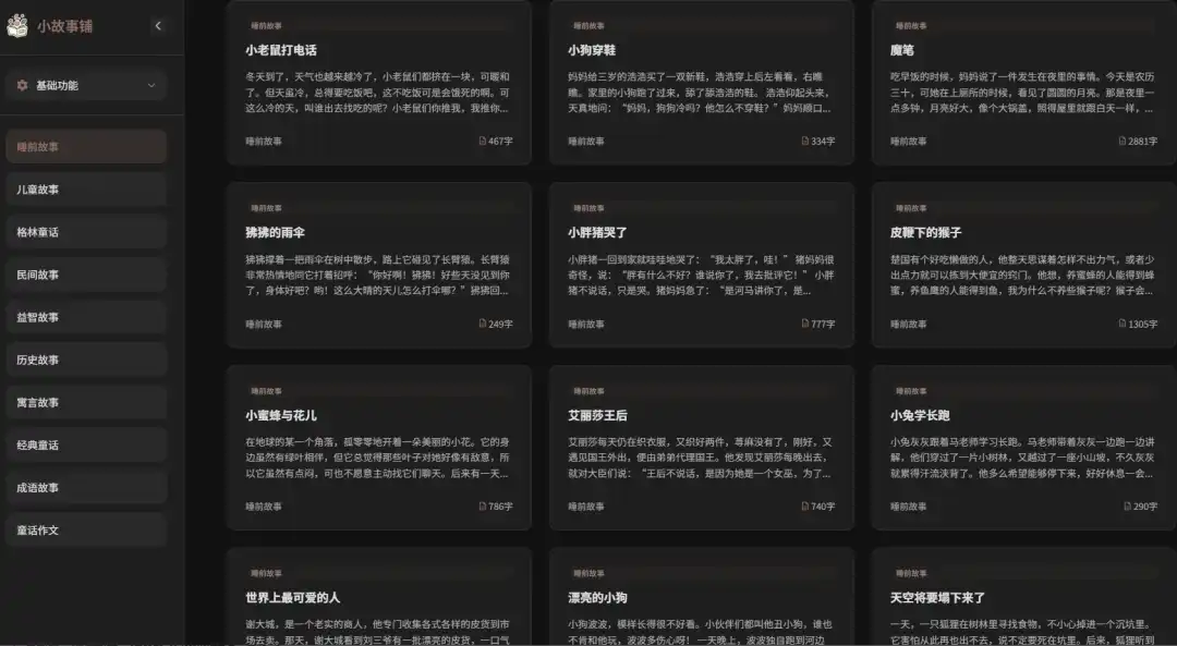 拥有丰富的各类睡前故事,包含儿童故事、格林童话、民间故事、益智、历史、寓言故事等各个类别。